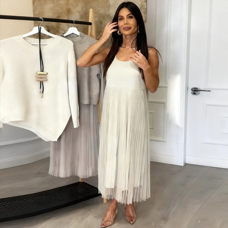 ELEGANTNA OBLEKA BREZ ROKAVOV Z NABITJI - Ta padajoča, nabrana midi obleka izžareva ženstven in eleganten čar. Zaradi lahke konstrukcije omogoča čudovito gibanje med hojo, zaradi česar je elegantna podlaga pod puloverjem ali pa jo lahko nosite samostojno.