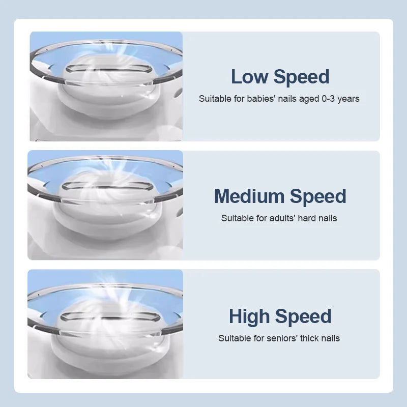 Ponuja tri nastavitve hitrosti za različne debeline nohtov in potrebe po negi. Z lahkoto se prilagodi velikosti in trdoti nohtov odraslih in otrok, zaradi česar je orodje za vso družino, ki zagotavlja popolnoma urejene konice prstov.