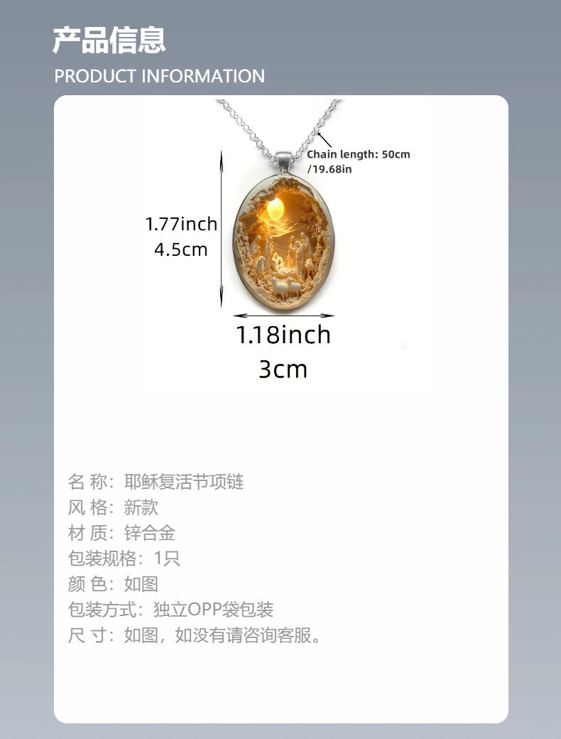 Ta obesek ujame Jezusovo rojstvo in sveti trenutek njegovega prihoda prenese v umetniško delo, ki ga je mogoče nositi. Vsaka podrobnost – od svete družine do pastirjev v okolici – simbolizira mir, odrešenje in božansko milost.