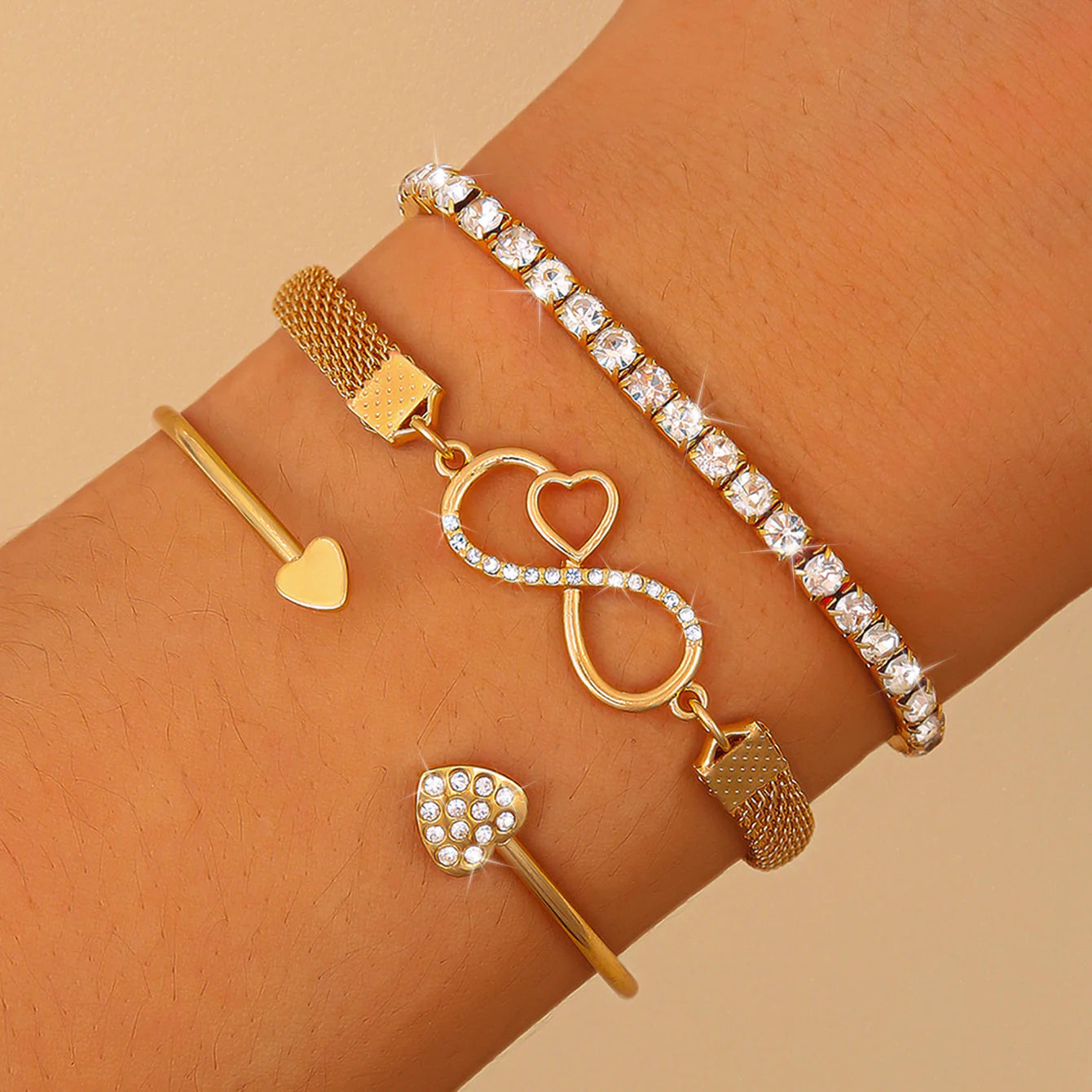 Ta komplet treh zapestnic iz češkega zlata odlično združuje eleganco, bleščice in stil ter vsakič zagotavlja nepozaben videz. Te zapestnice bodo vsaki obleki dodale pridih razkošja. Ne glede na to, ali se udeležujete večernega dogodka ali želite popestriti svoj sproščen videz, vas bodo postavile v središče pozornosti.