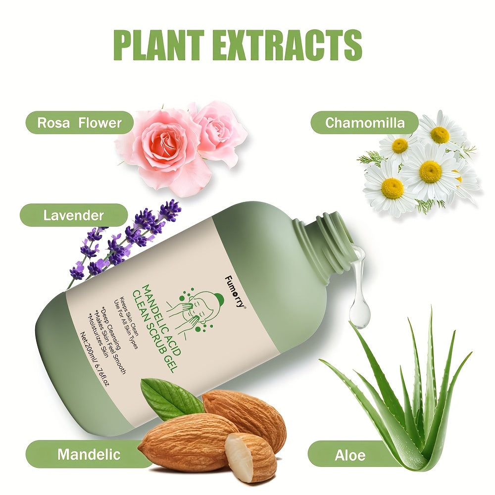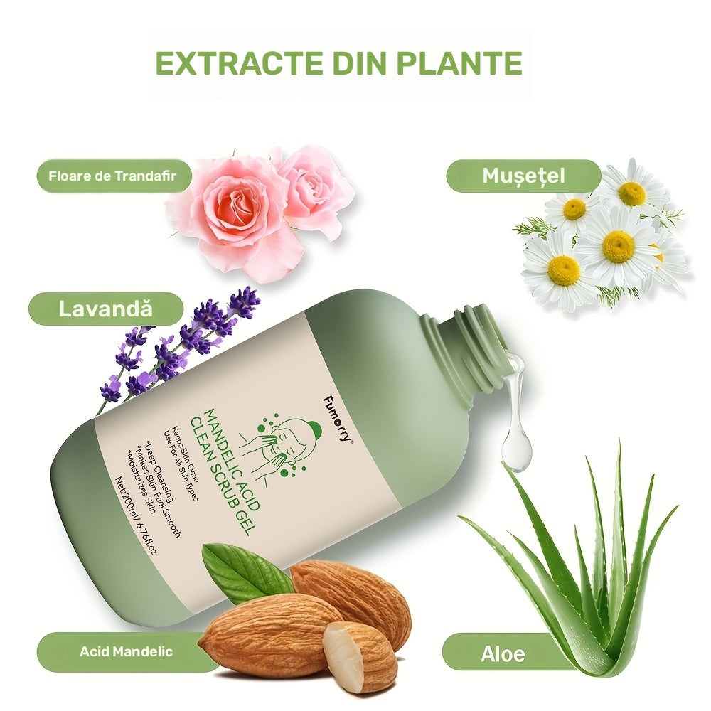 产品广告语:Gel Exfoliant cu Acid Mandelic, Conține Aloe Vera, Trandafir și Musetel, Curăță Profund, Hidratează Durabil Poriile Gel de Scrub pentru Față și Corp