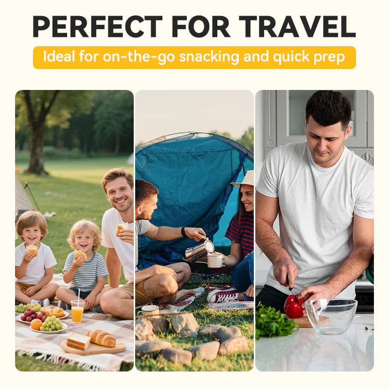3-V-1 VEČNAMENSKO ORODJE: Lupilec sadja, mini nož in rezalnik škatel v enem kompaktnem orodju – idealno za vsakodnevna kuhinjska opravila, potovanja in razpakiranje.